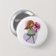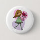 Cute mini art of a whimsical girl with long flowing yellow hair and wearing a green dress and striped stockings. She is holding a beautiful bunch of red roses in her outstretched hands. Originally made as digital art, An adorable piece of artwork ideal for decorating your jacket or bag.