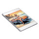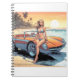A modern portrait of a charming girl, with a sports car, in a beautiful landscape of sea and beach, with warm colours at sunset. Computer graphic