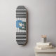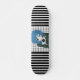 A cool skateboard with bold and modern black & white stripes, a cool gingham pattern and a girl comic character with a tablet in her hands with a peace symbol sticker on it.