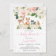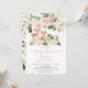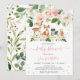 This invitation features cute woodland animals with blush pink florals and gold foil accents.