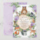 Celebrate the upcoming arrival of your little wild one with this whimsical woodland themed baby shower invitation. The design features a group of adorable forest animals (deer, bear, racoon, fox, bunny, skunk, squirrel & owl), pretty purple florals and lush watercolor greenery.