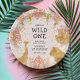 These "wild one" jungle safari themed girl's first birthday party paper plates feature gold faux foil animals (giraffe, lion and monkeys), gold and pink jungle foliage, and a sprinkling of gold confetti on a pale pink background. Add the name of the birthday girl and other text in black.