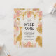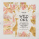 This "wild one" jungle safari themed girl's first birthday party invitation features gold faux foil animals (giraffe, lion and monkeys), gold and pink jungle foliage, and a sprinkling of gold confetti on an ecru background. Add the name of the birthday girl and party details in black text. A coordinating frame pattern of pink and gold leaves appears on the reverse.