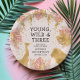 These "young, wild and three" jungle safari themed girl's third birthday party paper plates feature gold faux foil animals (giraffe, lion and monkeys), gold and pink jungle foliage, and a sprinkling of gold confetti on a pastel pink background. Add the name of the birthday girl and other text in black.
