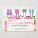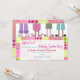 A birthday slumber party invitation featuring an illustration of four pairs of feet wearing flamingo, bear, cat, and bunny slippers. Pyjamas have purple, pink, green, and turquoise colour scheme. Background is plaid. Personalise the text.