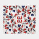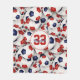 This sporty soccer themed fleece blanket for girls or boys features a randomly arranged pattern of red, white and blue soccer balls in varying sizes turned every which way in what appears to be an endless pile of balls - player name in an "autograph" style font and large jersey number in a varsity-letter style font are customisable - by katz_d_zynes