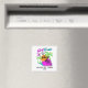 It was a bit smaller than expected, but I was too excited to check dimensions. The product itself send well printed though the grey text is a bit paint. Magnet worked perfectly on my fridge.