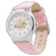 This magical and cute fairytale-themed kids watch design features a prince and princess, with an enchanted pink castle, butterfly’s, flowers, hares, a magical deer, and whimsical mushrooms. This pink and girly “once upon a time” design can be easily personalised with your girls name in an elegant font.