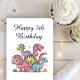 This adorable watercolor design includes watercolor dinosaurs in various hues of purple, pink, and green. This dinosaur birthday card design also includes the phrase "Happy Birthday!" on the front of the card. The inside of the card includes a place to add a name as well as the phrase "Hope your birthday is T-riffic!"