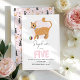 A cute kids birthday invitation for girls featuring a playful ginger tabby cat with a pink ball on the front and space for personalisation. The back showcases an all-over cat pattern for extra charm. Designed as a fifth birthday invite but easy to customise for any age. Perfect for a kitty cat or kitten themed party.