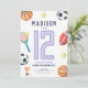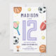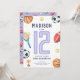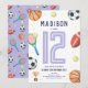 This cute and modern sports-themed kids birthday invitation design features a purple sports cartoon design, with a basketball, football, soccer ball, tennis racket, trophy, and stars. The invite can be personalized with your girls name and other details necessary for your party. The perfect sports-themed addition to your child's birthday party! This invitation is set for a 12th birthday, but this is easy to edit under 'personalize this template' for a different birthday.