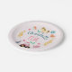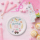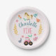 This cute and rustic girls birthday paper plate design features farm animals, with a pink tractor, horse, pig, rabbit, chickens, barn, and flowers, and can be personalised with your kids name and age. The perfect farm-themed addition to your toddler's farm-themed birthday.