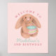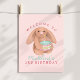 A cute and girly plush bunny rabbit birthday welcome poster featuring a soft-toy style bunny holding a cake. Personalize with your child’s name and age. Perfect for bunny-themed, woodland, or cuddly girls’ birthday parties.
