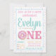 Girl doughnut first birthday party invitations with cute pink sprinkle doughnut and sprinkle background. This doughnut birthday party invitation is easily customised for your event by adding your details.