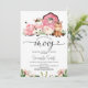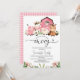 Sweet farm themed baby shower invitation featuring a farmyard scene with a pink barn and a pink plaid pattern back. The design features four cute farm animals and a removable calligraphy font image. This farm baby shower invitation is a sweet way to invite guests to a girl's farm themed baby shower.