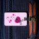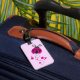Cute id kids luggage label featuring a flying ladybug / ladybird with hearts. Personalise with your name and address details on the reverse. Uniquely designed by Sarah Trett.