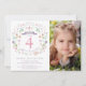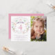 This elegant and pretty third birthday invitation features an illustrated floral wreath with the words "Let's Celebrate" encircling the number 4. The text colour, font, message, and photo can be changed to your liking. The back of the invite features a pink background (that can be swapped to any colour of your choice) with a white quatrefoil pattern. A perfect way to invite guests to celebrate a girl's special birthday.
