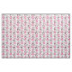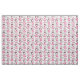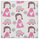Fun, colourful, whimsical fabric great for girls, features little girls with pink dresses with a white heart, lots of pink cars, and hearts of pink on blue circles all on a white background.