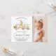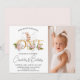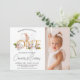 Sweet girls first birthday invitation featuring a gold word and pink colored flowers as well as little bunny in a bathtub illustration. Ideal for someone looking for a cute photo bunny themed first birthday invitation.