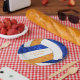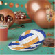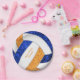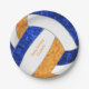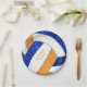 These girls' volleyball birthday party 7" paper plates feature a girly blue, orange and white volleyball graphic with customisable "Happy Birthday" greeting and girl's name - the blue and orange panels of the volleyball are blended with a pretty floral kaleidoscopic pattern, and the white volleyball panels are blended with an abstract swirl pattern for a textured appearance that is artsy and girly - by katz_d_zynes