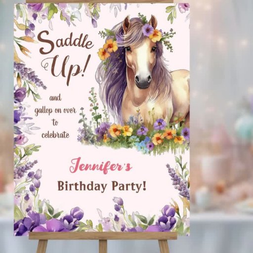 Girls Horse 10th Birthday Purple Floral Saddle Up Invitation