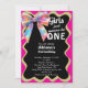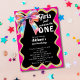 Girls Just Wanna Be One Retro 1st Birthday Party Black Invitation - Celebrate your little girl's first milestone with this fun and colourful first birthday invitation. Featuring a retro 80s design with bright neon colours like magenta hot pink, teal, yellow, orange and purple squiggle frame and a holographic coquette bow. Perfect for throwing an 80s themed first birthday party or retro glam bow 1st birthday celebration. Available in both print and digital formats. Customise this editable first birthday party invitation for girls with your own event details.