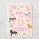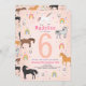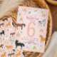This cute girls’ birthday invitation features a pastel pink background with unicorns, horses, rainbows, and stars, plus a matching magical pattern on the back. Easily edit the front with your child’s details and age — perfect for any unicorn or horse-themed birthday party.