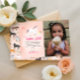 This cute girls’ birthday thank you card features a pastel pink background with unicorns, horses, rainbows, and stars, space to add a photo, plus a matching magical pattern on the back. Easily edit the front with your child’s message and name — perfect for any unicorn or horse-themed birthday party.