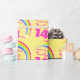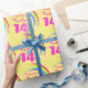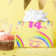 Birthday wrapping paper in a colourful rainbow with stars and yellow sky design. Personalise this girls birthday paper with your own name and age 10 to 19. Currently reads Happy Birthday Kaitlyn 14 today. Perfect for wrapping a special 14th birthday gift. Uniquely designed by Sarah Trett.