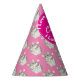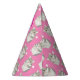 This girls party hat features a Cute Grey and white hamster pattern design, with a fluffy hamster on a bright pink background. The name can be changed.