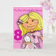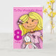 This card says: To my wonderful niece 8 today. Inside: Happy Birthday. Or customise with your own words. Fun card blonde hair girl cuddling her white bunny illustrated and designed by Sarah Trett.