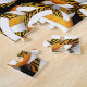 This girly volleyball jigsaw puzzle features a pattern of varied size orange / gold and white volleyballs turned every which way on a black background - some of the orange volleyball panels have a wild zebra stripes accent - customise with volleyball player's name and jersey number - by katz_d_zynes