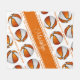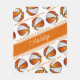 This cute basketball themed fleece blanket features the realistic images of basketballs that have alternating orange and white panels arranged in an angled mirrored pattern - the phrase "The basketball court is my happy place" in a casual handwritten-style font in orange stretches between the angled rows of basketballs - athlete's name can be personalised on a similarly angled full width orange colour strip - background is customisable white - by katz_d_zynes