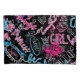 A seamless pattern for girls' wear, featuring calligraphic slogans and hearts.