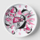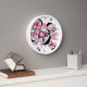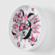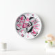 This cute girl's basketball themed wall clock features an "explosion" of varied size pink, white and black basketballs and grey and pink star shapes with overlying clock face numerals - customise athlete's name, monogram and jersey number - by katz_d_zynes