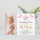 Sweet girls first birthday invitation featuring a gold world and pink colored flowers as well as a unicorn head and pink bows. Ideal for a unicorn themed first birthday party for a bay girl.