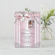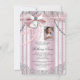 Pink photo first communion invitation with elegant silver and grey background and pretty pearls and pink bow with cross and heart, and beautiful pink picture frame for your photo. This beautiful pink first communion invitation is easily customised for your event by simply adding your photo and event details in the font style and colour and wording of your choice. You can crop your photo and move the frame to wherever you need, as we as make it smaller or larger. This is a printed design with no real ribbons, bows, pearls, glitter, etc.