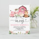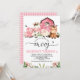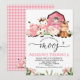 Sweet farm themed birthday invitation featuring a farmyard scene with a pink barn and a pink plaid pattern back. The design features four cute farm animals and a removable calligraphy font image. This farm invitation is a sweet way to invite guests to a girl's farm themed birthday party.