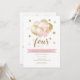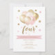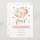 Girl's Pink and Gold Birthday Party Invitation which is designed for a 4th birthday but can be edited for any age. The design features gold and pink sparkly, glitter balloons. The design features pink and gold confetti around the balloons. The invitation can be customised with your little one's details.