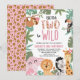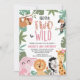 Cute safari born to be wild 2nd birthday invitation featuring six jungle animals, pink and brown cheetah print pattern, tropical foliage and non editable text. This born to be wild second birthday invitation is ideal for a jungle themed second birthday party for a girl.