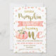 Sweet girl's polka dots watercolor pumpkin birthday invitation for a first birthday. The invitation features a pink pumpkin floral arrangement some faux gold foil dots and heading. The back of the invitation is a pink watercolor wash with a white polka dot pattern.