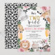 Cute girl's two wild themed 2nd birthday invitation featuring six cute jungle animals, green foliage, pink roses, balloons and cheetah print pattern in gray and black.