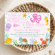 Girls colorful oneder the sea first birthday invitation featuring various under the sea creatures, retro style text and seaweed. A cute invitation for a girl's first birthday party.