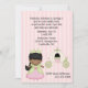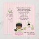 Sweet girl's Princess birthday party invitation done in pink and green. Graphics of a cute dark skinned girl dressed as a Princess next to a pretty pumpkin coach, with a pink and white striped background. The dark grey text is fully customisable to personalise for your daughter's big day.