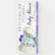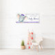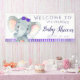Girls elephant baby shower banner with adorable baby girl elephant with a cute purple bow on a pretty purple stripe background. This cute elephant baby shower banner is easily customised with your details.