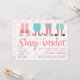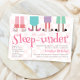 A birthday slumber party invitation featuring an illustration of four pairs of feet wearing flamingo, bear, cat, and bunny slippers. Pyjamas have pastel scheme. Background is pink chequerboard pattern.