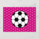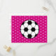 A birthday postcard invitation featuring an illustration of a soccer ball over a pink background with white polka dots. Personalise the text on opposite side.