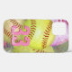 Girl's softball iPhone tough case with pink and bright yellow softballs and customisable jersey number and name by katz_d_zynes ::: also available for other iPhone models as well as iPad and Samsung devices ... for other devices, select your device type from the “Style Options” section on this page … for customisation assistance, simply click the “Ask this Designer” link below