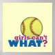 Pitchers, catchers, shortstops and ball players of all ages will love this softball design. Who says girls can't play softball? Girls Can't WHAT?