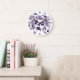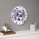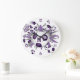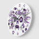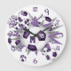 This cute girl's soccer themed wall clock features an "explosion" of varied size purple and white soccer balls and purple, grey and white star shapes with overlying clock face numerals - personalise the athlete's monogram and jersey number - by katz_d_zynes